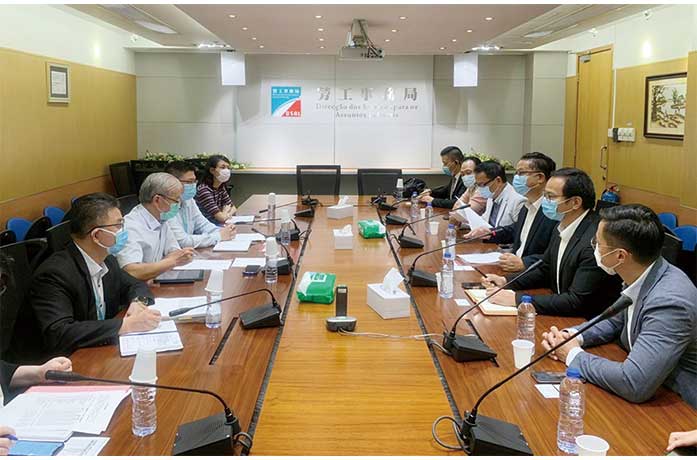 【特訊】日前多位博彩中介人在立法議員梁孫旭的陪同下拜訪了勞工事務局局長黃志雄、副局長陳元童,代副局長陳俊宇等人。亞洲責任博彩聯盟副會長、貴賓廳負責人余堯洪表示,受疫情及通關限制影響,本澳博彩業受到嚴重衝擊,當中除了六大博企之外,貴賓廳的業務同樣水深火熱,目前已有不少貴賓廳暫停營業,希望特區政府關注貴賓廳僱員的就業狀況,冀透過適切的就業輔助和實施帶津培訓,為已離職及放無薪假的貴賓廳僱員提供援助。