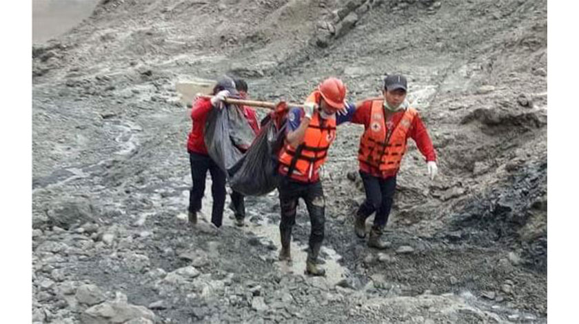 2日,救援人員在緬甸克欽邦帕甘地區轉移遇難者遺體(手機拍攝)。緬甸宣傳部2日發佈通報說,該國北部克欽邦帕甘地區一處礦區發生坍塌事故,造成至少96人死亡。新華社發(緬甸資訊部供圖)