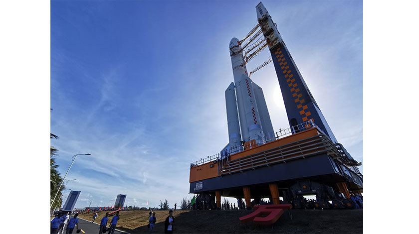 7月17日,長征五號遙四運載火箭在中國文昌航天發射場完成技術區總裝測試工作後,垂直轉運至發射區,計劃于7月下旬到8月上旬擇機實施中國首次火星探測任務(行星探測工程『天問一號』任務)。圖為垂直轉運的長征五號遙四運載火箭。(中新社發 張高翔 攝)