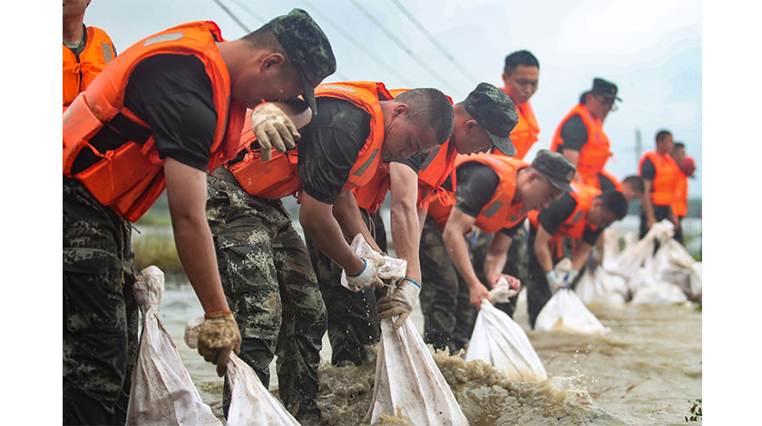 27日,為保安徽巢湖安瀾,安徽省廬江縣裴崗聯圩主動開堤分洪。13時45分,在裴崗聯圩裴河段,幾台挖掘機同時作業,將開挖出一條120米寬的洩洪通道,另打開兆河沿線4道涵閘,分洪總流量將達150立方米每秒。截至當日12時,裴崗聯圩受影響範圍內的8426名民眾已全部轉移。圖為武警官兵在搬運砂袋。(中新社記者 蔣啟明 攝)