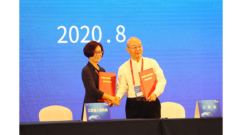 12日,江西省委常委、省政府副省長吳忠瓊與正和島創始人劉東華分別代表江西省人民政府和正和島簽訂戰略合作框架協議。當日,由江西省政府和正和島聯合主辦的『2020正和島(江西)創變者年會』在南昌開幕,千餘位企業家齊聚此間,共話疫後商業新局勢。(中新社記者 劉佔昆 攝)