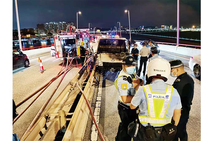 【特訊】友誼大橋昨晚發生貨斗車著火事件。一輛沿友誼大橋澳門往氹仔方向的貨斗車,行駛期間貨斗上雜物起火,火勢一度猛烈,消防接報到場將火撲熄,貨斗上雜物和車廂焚毀,警方調查火警原因。