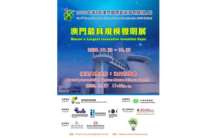 【特訊】為配合國家“十三五規劃”、“一帶一路”和“粵港澳大灣區”之建設部署,通過搭建本澳與國際創新發明的交流平台和國際青少年、企業之創新發明作品互相交流與分享,藉此推廣科普知識,促進科學技術的進步與發展。 澳門創新發明協會已連續舉辦了七屆的澳門國際創新發明展,惟今年受新冠肺炎疫情影響,將不設場地展覽,“2020年第8屆澳門國際創新發明展”將改以線上模式在十月二十三日至二十五日進行評審,並在十月二十七日下午五時於澳門科學館會議廳舉行“2020年第8屆澳門國際創新發明展”頒獎典禮。