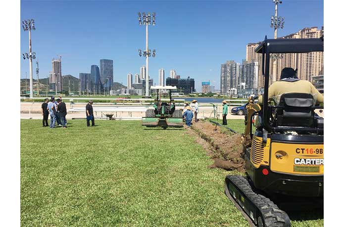 【特訊】澳門賽馬會為迎接新馬季來臨,草地跑道排水改善工程已於8月25日正式動工,為馬會帶來更安全之競賽跑道,是次工程將圍繞草地跑道加設排水坑,藉此加強草地跑道排水能力及改善積水問題。草地工程現階段進度順利,將會比之前預期的時間更快完工,屆時能盡快恢復編排草地賽事。在工程進行期間,根據澳門天氣記錄,於9月8日曾出現紅雨警示,雨量頗多,其後跑道部同事作檢測,發現跑道排水數據與以往作比較,排水速度快了4.8%,可見此工程的成效,相信待工程完成後,將為馬匹帶來煥然一新的跑道。