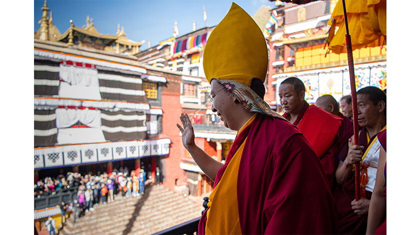 16日,十一世班禪在扎什倫布寺朝拜途中,在千佛廊三樓向信眾、遊客揮手致意。當日,十一世班禪朝拜了日喀則扎什倫布寺的主要佛殿。扎什倫布寺是歷代班禪的主寺,始建於1447年,是藏傳佛教格魯派六大寺院之一。(中新社記者 何蓬磊 攝)
