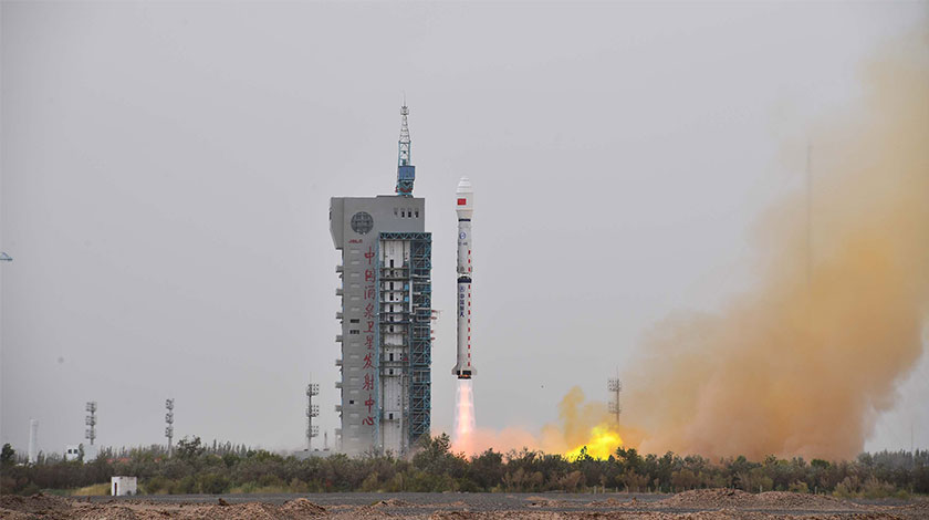 北京時間9月21日13時40分,中國在酒泉衛星發射中心用長征四號乙遙四十一運載火箭,成功將海洋二號C星發射昇空。海洋二號C星將與2018年10月發射的海洋二號B星以及後續的傾斜軌道衛星組網運行,共同構成中國海洋動力環境監測網,可在6小時內完成全球80%的海面風場監測。圖為長征四號乙遙四十一火箭發射昇空。(中新社發 汪江波 攝)