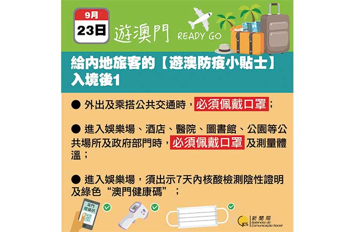 【又訊】隨着全國赴澳門旅遊簽注恢復及“十‧一”國慶黃金周臨近,預計市面零售場所的人員流動將逐步增加,經濟局及消費者委員會派員到旅遊區,宣傳零售業的防疫指引。同時,瞭解商戶的落實執行情況,呼籲業界做好防疫工作,讓旅客安心來澳旅遊購物。