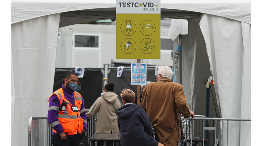 8日,民眾在比利時布魯塞爾的一個新冠病毒檢測點門口瞭解資訊。 為遏制新冠疫情進一步蔓延,比利時政府規定,從9日起,民眾如果不戴口罩與他人聚會,人數規模從先前的5人下調至3人;酒吧和咖啡館晚11時後不得營業。9月20日以來,比利時新增確診病例超過3萬例。(新華社記者鄭煥松攝)