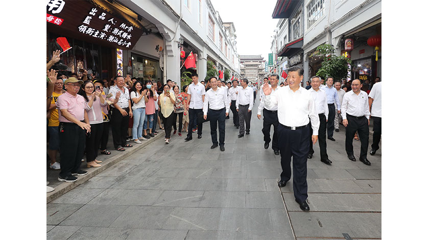 10月12日,中共中央總書記、國家主席、中央軍委主席習近平在廣東考察調研。這是習近平考察潮州市牌坊街時,向現場群眾揮手致意。(新華社記者 王曄 攝)
