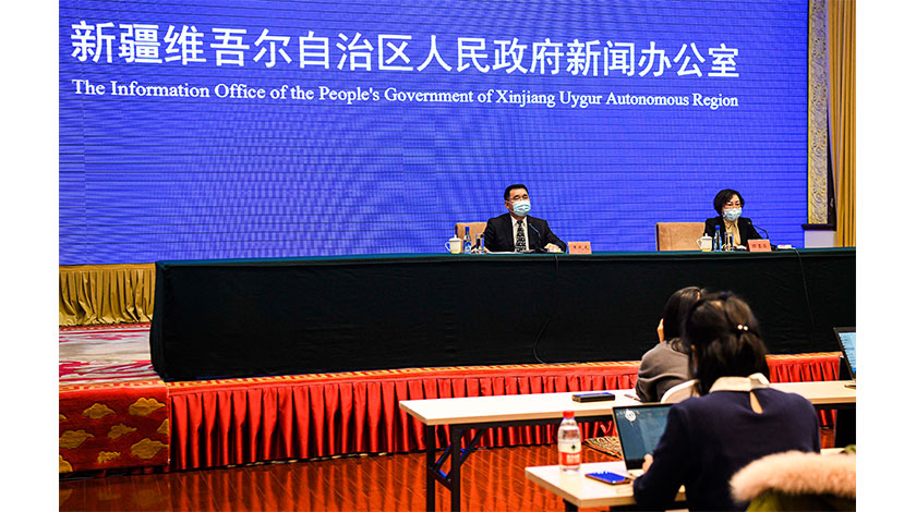 10月25日,新疆维吾尔自治区人民政府新闻办公室在乌鲁木齐市举行新闻发布会。(新华社记者 王菲 摄)