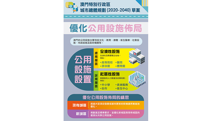 為此,《澳門特別行政區城市總體規劃(2020-2040)》草案提出優化本澳的公用設施佈局,劃定用於建設提供全澳性且獨立佔地的公用設施區,除維持現時尤其集中於北安區、路氹區及澳門大學新校區的公用設施區外,於北區-1、東區-2、外港區-2、氹仔北區-1及路環區增設公用設施區;至於社區性的公用設施,則主要考慮當區的人口數量及實際服務需要,將根據總體規劃提出的指導性要求,參考各權限部門的相關標準,於詳細規劃階段作具體設置。