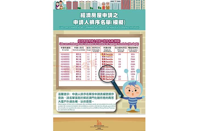 根據經第11/2015號法律修改的第10/2011號法律《經濟房屋法》規定,房屋局按“先初審、後抽籤、再實質審查”制度進行。經初步審查後,獲接納申請有35765份;被取消資格的申請有1722份,原因包括:申請人於今期申請中提交多於一份的申請表、在規定的期限內未填補文件上的缺漏,以及自行放棄申請等。