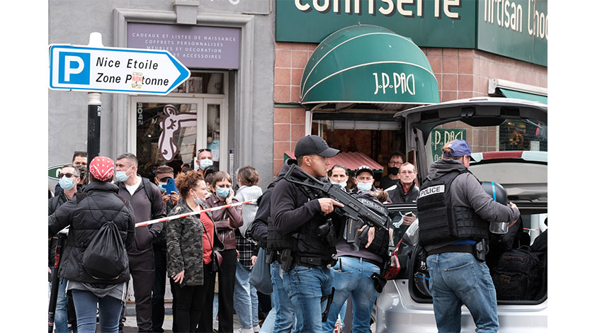 29日,員警在法國尼斯發生持刀傷人事件的教堂附近展開工作。法國東南部城市尼斯聖母大教堂附近29日上午發生一起持刀傷人事件,導致至少3人死亡、數人受傷。新華社發(塞爾日•阿烏齊攝)
