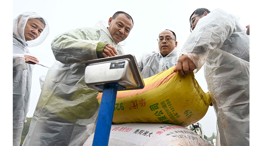 2日工作人員對第三代雜交水稻晚稻進行稱重。當日,位於湖南省衡南縣的第三代雜交水稻新組合試驗示範基地晚稻測產結果出爐,其平均畝產達到911.7公斤。加上今年7月測得的早稻平均畝產619.06公斤,這意味著由袁隆平團隊培育的第三代雜交水稻早晚雙季稻平均畝產突破1500公斤(3000斤),達到1530.76公斤。(中新社記者 楊華峰 攝)