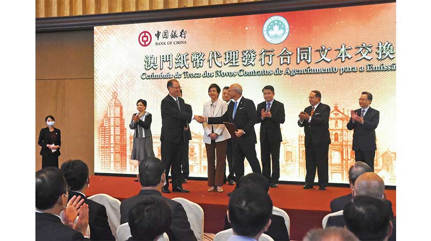 活動上,金融管理局行政委員李可欣分別與中銀澳門分行行長李光及大西洋行政總裁區偉時交換澳門紙幣發行代理合同文本。