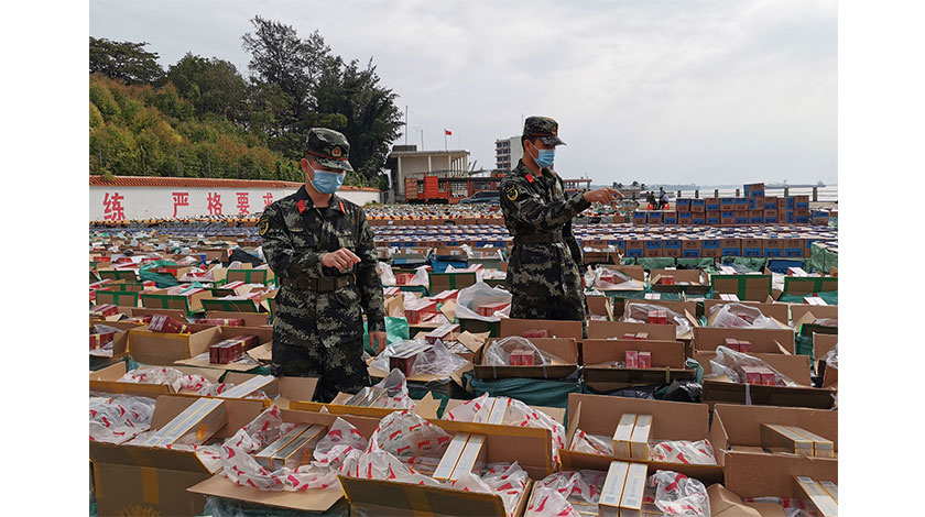 11月16日,廣東海警局通報,廣東海警日前在湛江市查獲一起特大走私香煙案,查獲涉案鐵殼散貨船1艘、涉案人員8名,當場查扣涉嫌走私香煙30余萬條,貨值近7000萬元人民幣,該起案件系廣東海警局成立以來查獲的貨值最大的走私香煙案。圖為清點涉案香煙。(中新社發 敖玉洪 攝)