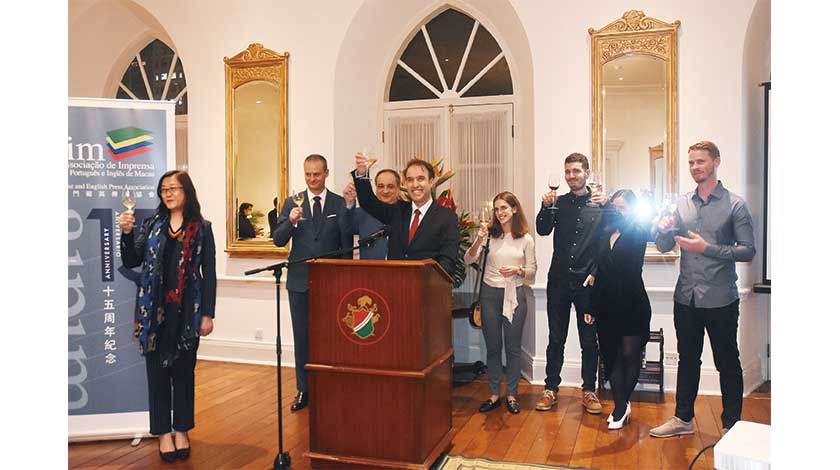 慶祝酒會昨假陸軍俱樂部舉行。新聞局局長陳露、副局長黃樂宜、中聯辦宣文部處長田小平、外交公署新聞部主任鄭新友、葡國駐港澳總領事歐冠溢等嘉賓,以及多間媒體機構及業界社團代表出席。