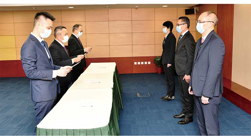 【特訊】司法警察局於昨日在總部大樓舉行主管就職儀式,由薛仲明局長監誓,並在杜淑森副局長、陳堅雄副局長以及各部門主管的見證下,情報及支援廳廳長岑錦榮、情報綜合處處長莫向堯、網絡安全處處長何永堅三位新任主管分別宣誓就職。