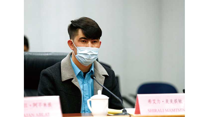 21日,中國外交部在北京舉行新疆維吾爾自治區涉疆問題新聞發佈會。針對有記者問:中國是否強迫維吾爾族工人工作時,來自中國新疆和田地區、在一家服裝企業務工的希艾力•麥麥提敏說:『難道我們出來務工,多掙些錢、多學些本領,用自己的雙手改變生活,還需要別人強迫嗎?』(中新社記者 富田 攝)