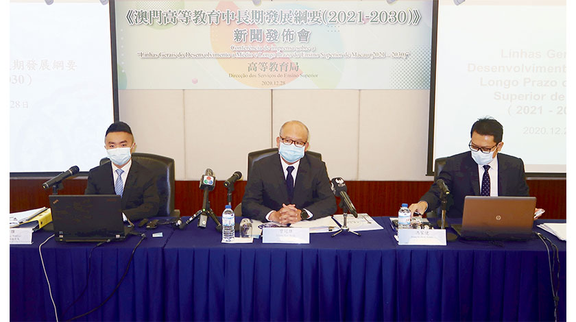 高等教育局昨假該局舉行發布會,介紹《澳門高等教育中長期發展綱要(二零二一至二零三零)》。高等教育局代局長曾冠雄、高等院校協調廳廳長丁少雄及研究規劃處處長馮家健出席發布會及介紹有關《綱要》。