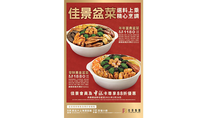 【特訊】牛轉乾坤行大運,佳景年年享口福。佳景集團旗下四五六上海酒菜館出品的新春賀年盆菜現正熱賣中,多款高質食材共冶一爐,滿滿一盆為您送上無限祝福,吃出豐盛一年。凡佳景會會員及中銀卡戶惠顧更可尊享88折優惠,供應期由即日起至2月28日。數量有限,欲購從速。