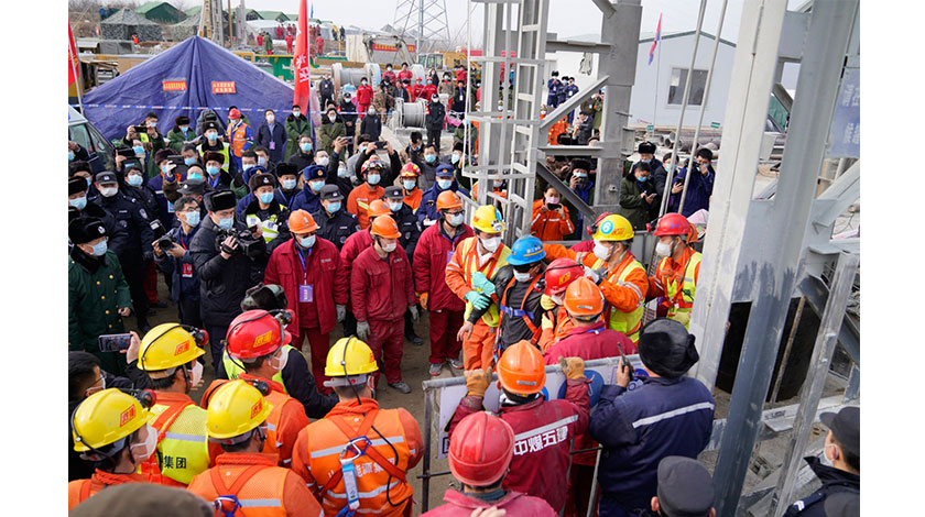1月24日,山東棲霞笏山金礦事故救援取得新進展,已取得聯系的11人全部成功升井。上午11時許,救援人員從井筒進入四中段(距地面546米),成功救出1人,升井並送醫救治,隨後又陸續救出10名被困礦工。圖為救援現場。(中新社發 鄒剛 攝)