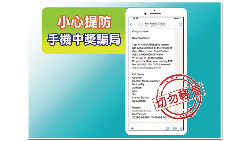 【特訊】昨日,司法警察局接獲“司警局婦女防罪之友”會員舉報,指其手機WhatsApp帳號收到一條來歷不明的英語訊息,內容稱其WhatsApp手機號碼在WhatsApp全球獎勵計劃中被選為100萬美元的獲獎者,並要求該會員將獲獎編號連同姓名、國籍、聯絡電話、年齡、性別及住址等個人資料電郵至指定電子郵箱,以領取獎金。由於近日司警局曾發出警情通告提醒市民防範手機通訊軟件詐騙,故其有所警惕,沒有上當,並馬上向司警局作出舉報。