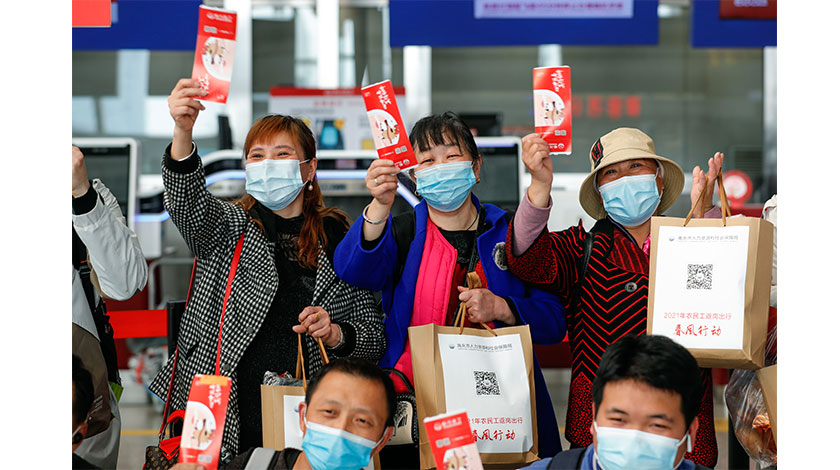 2月23日,來自四川省南充市高坪區的返崗農民工在成都雙流國際機場準備乘坐專機返崗。當日,近200名農民工乘坐四川航空春節後首個返崗包機從成都雙流國際機場起飛,前往廣州。據瞭解,今年四川省針對川籍農民工開展『天府情緣•護你返崗』活動,實施『點對點一站式』返崗專機直達運輸服務。2月23日至28日期間,川航計畫執飛20多架次包機運送農民工前往北京、上海、廣州、深圳、杭州、寧波、福州等地返崗。這是四川省首次大規模集中組織專機運送農民工返崗。(新華社記者 沈伯韓 攝)