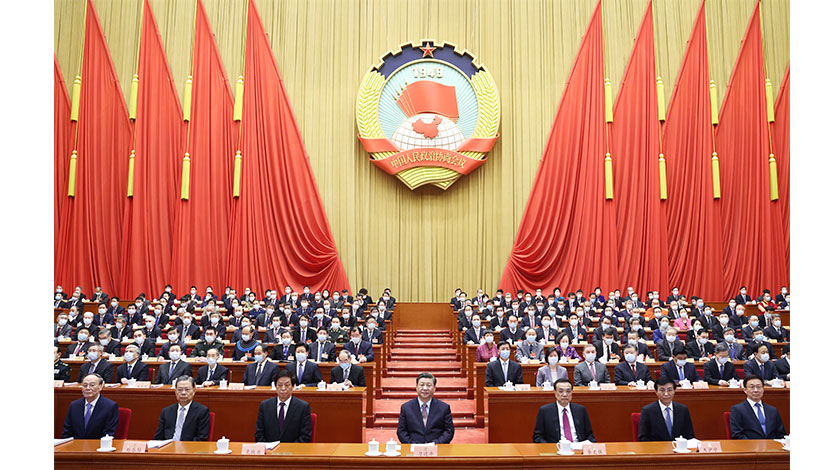 4日,中国人民政治协商会议第十三届全国委员会第四次会议在北京人民大会堂开幕。这是习近平、李克强、栗战书、王沪宁、赵乐际、韩正、王岐山在主席台就座,汪洋代表政协第十三届全国委员会常务委员会向大会报告工作。(新华社记者 鞠鹏 摄)