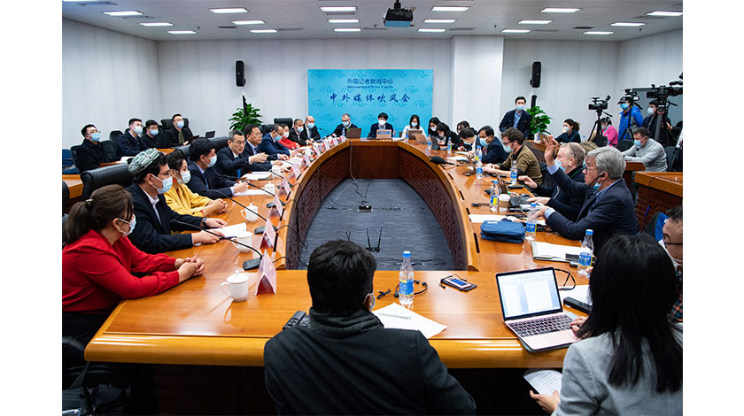 3月18日,新疆維吾爾自治區涉疆問題發佈會在北京舉行。圖為外國媒體舉手提問。(中新社記者 侯宇 攝)