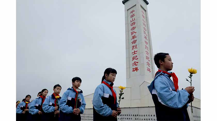 4月1日,華鎣市雙河第三小學學生在華鎣山遊擊隊革命烈士紀念碑前開展緬懷先烈活動。