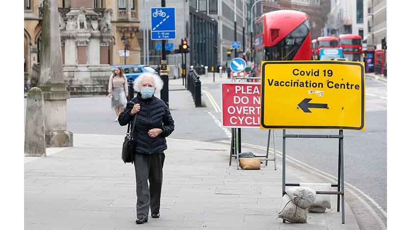 3月31日,一名戴口罩的女子走過英國倫敦一家新冠疫苗接種中心外的標識牌。新華社記者 韓岩 攝