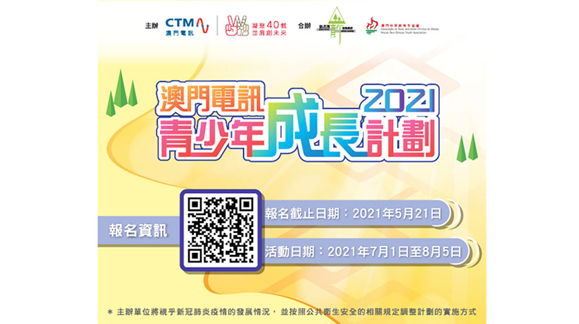 由澳門電訊主辦、鮑思高青年服務網絡及澳門中華新青年協會合辦的「澳門電訊青少年成長計劃2021」,由即日起至5月21日期間接受報名,對象為年滿18歲或以上本地應屆中學畢業生或大學生。