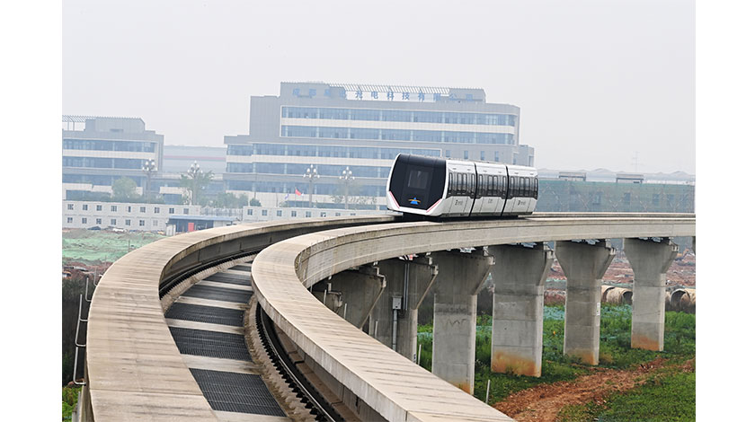 時速160公里內嵌式磁浮交通系統在成都亮相4月22日新築股份在成都新津建設了3.6公里的中低速磁浮模擬商業運營試驗線,列車最高運行時速為169公里,速度滿足市域等交通的需要。圖為運行中的內嵌式磁浮交通系統列車。(中新社記者安源攝)