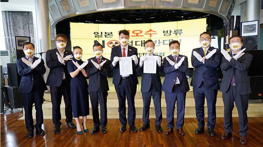 4月28日,中國在韓僑民協會總會、漢城華僑協會、韓國中華總商會等中韓12個民間團體于首爾發表聯合聲明,抗議日本核廢水排放入海。(中新社記者曾鼐攝)
