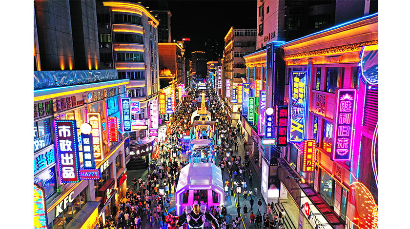2日晚,江西南昌,民眾在勝利路步行街休閑購物。為恢復百年老街的往日繁華,當地開展勝利路步行街『勝利歸來』主題活動,打造潮玩、消費於一體的活動街區,『五一』假期吸引民眾,形成新的節日經濟、夜間經濟和文化經濟。(中新社記者劉佔昆攝)