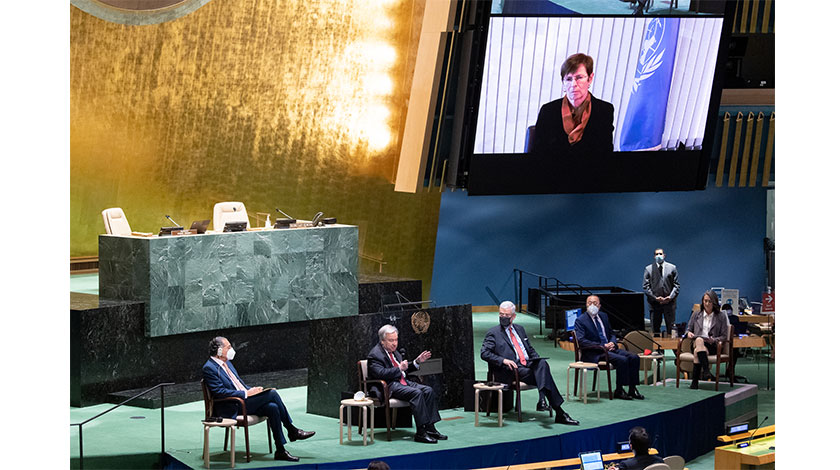 5月5日,在位於紐約的聯合國總部,聯合國秘書長古特雷斯(左二)、聯大主席博茲克爾(左三)、擔任聯合國安理會5月輪值主席的中國常駐聯合國代表張軍(左四)出席聯大紀念多邊主義與和平外交國際日互動對話會。5月5日,聯合國大會舉行紀念多邊主義與和平外交國際日互動對話會,擔任聯合國安理會5月輪值主席的中國常駐聯合國代表張軍同聯合國秘書長古特雷斯、聯大主席博茲克爾、聯合國經濟和社會理事會主席阿克拉姆、國際法院院長瓊•多諾霍作為聯合國五大機構代表共同出席會議,就支持多邊主義、加強聯合國作用等問題同聯合國會員國進行互動交流。新華社發(聯合國供圖/埃瑟金德爾•德貝貝攝)