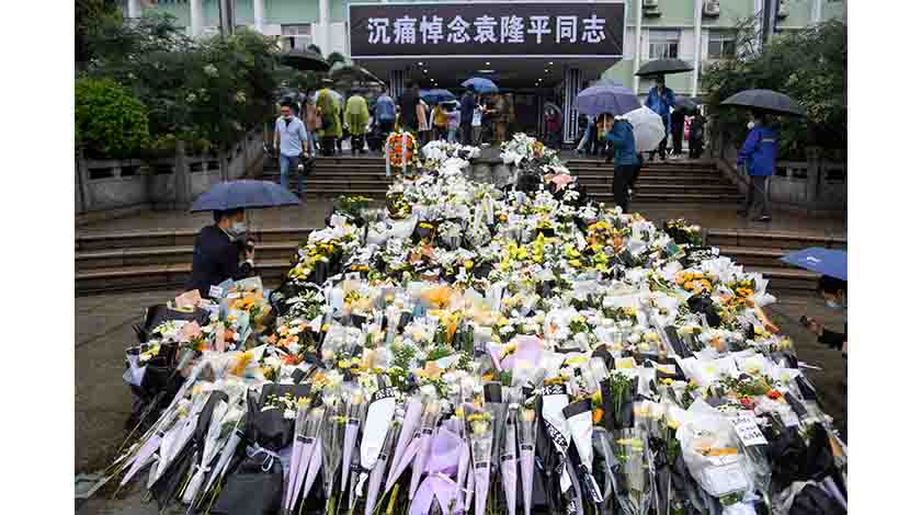 5月23日,湖南長沙,全國各地的民眾來到湖南雜交水稻研究中心悼念袁隆平,向袁隆平遺像獻花,並把想說的話製成卡片放在鮮花中。中新社記者楊華峰攝