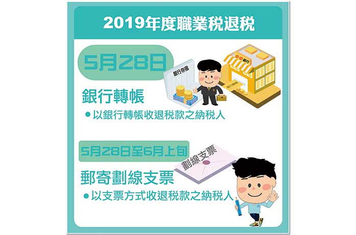 一如過往,退稅款項將以銀行轉帳及郵寄劃線支票兩種方式發放。於今年4月9日前已完成登記以銀行轉帳收取由財政局發放的退稅及給付金的納稅人,其退稅款項將於5月28日直接存入其已登記的銀行帳戶,約97% 納稅人透過轉帳收取退稅。其餘納稅人則會按照其在財政局登記的稅務通訊地址,陸續寄送劃線支票,預計6月上旬完成支票派發工作,於6月15日起接受補發支票申請。