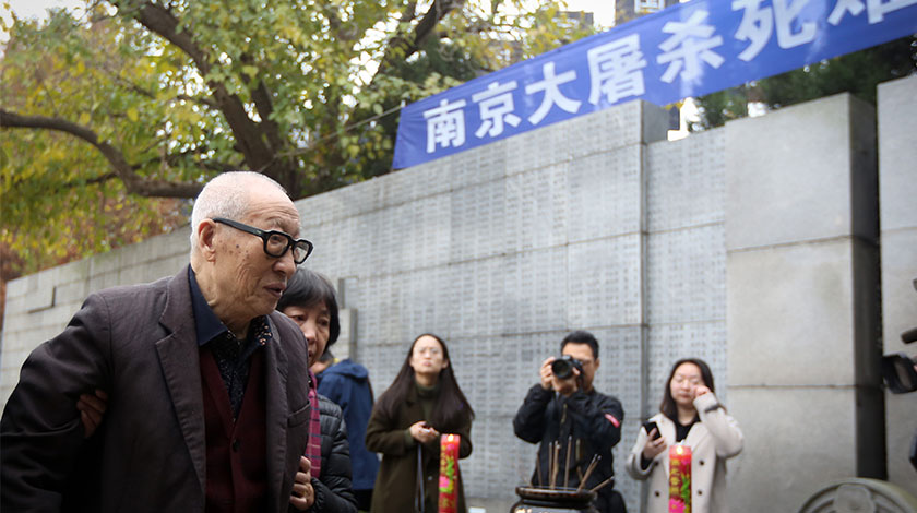 12月3日,南京大屠殺幸存者余昌祥(左)和他的家人祭拜遇難親人。當日,南京大屠殺死難者遺屬家祭活動正式啟動,遺屬們通過在侵華日軍南京大屠殺遇難同胞紀念館『哭牆』(遇難者名單牆)前獻花、敬香、跪拜和誦讀家信等形式,表達自己的哀思。(中新社圖片/ 泱波 攝)