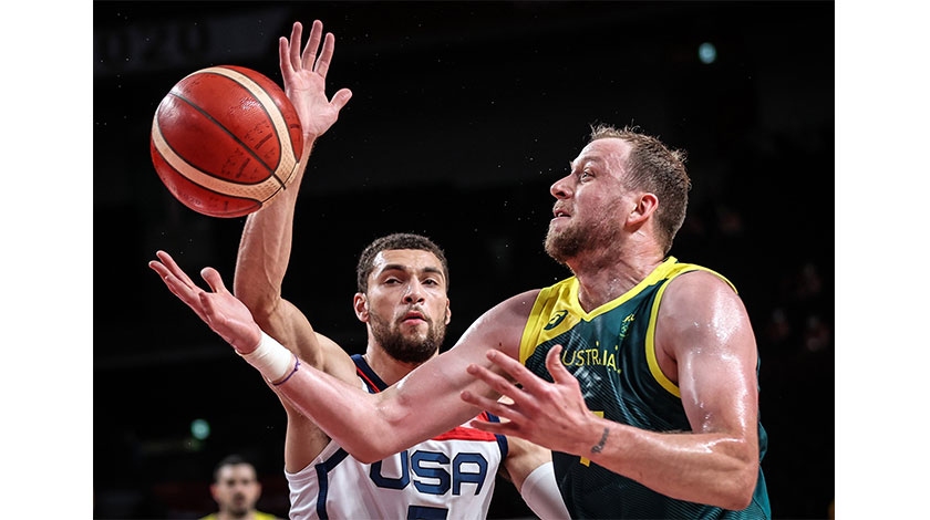 在東京奧運會男子籃球半決賽中,美國隊戰勝澳大利亞隊,晉級決賽(新華社)
