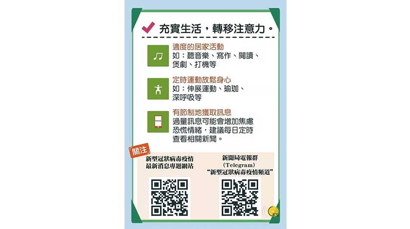 本澳衛生局去年及今波疫情都有指出,認同本澳市民出現了防疫鬆懈甚至抗疫疲勞的現象。對於抗疫疲勞,香港紅十字會建議,思考令自己出現疲勞的原因,例如是否因為減少社交聯繫,影響心情所導致;另外思想上亦要調節,明白防疫對自己同親友的重要性,保持正面態度,並對身邊親友相互支持,發揮正能量、正向思想。