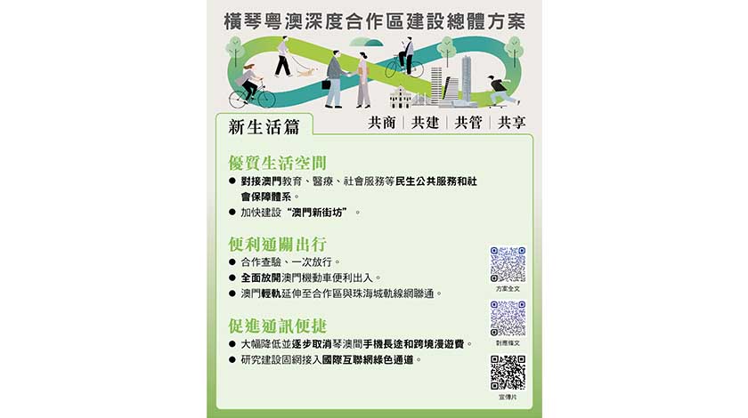 通關方面,貨物一線放開,二線管住;而人員則一線管住,二線不限。當中提及會加快推進澳大橫琴校區與橫琴口岸的專用通道建設,探索在此建設新型智能化口岸,高度便利澳大師生進出合作區。