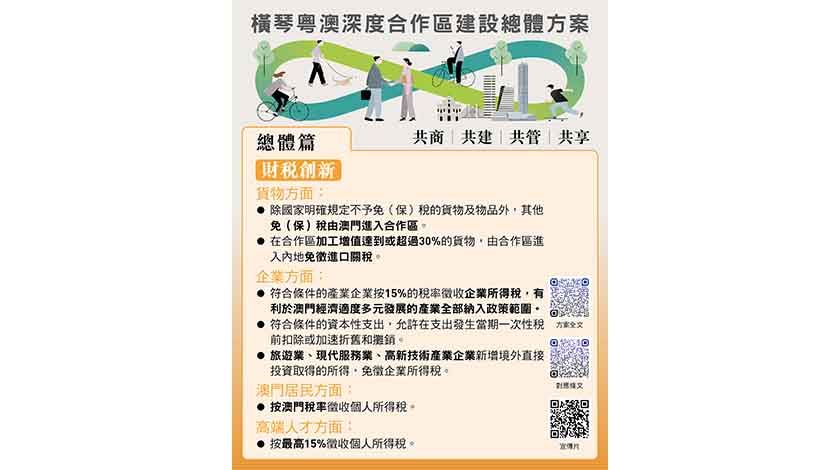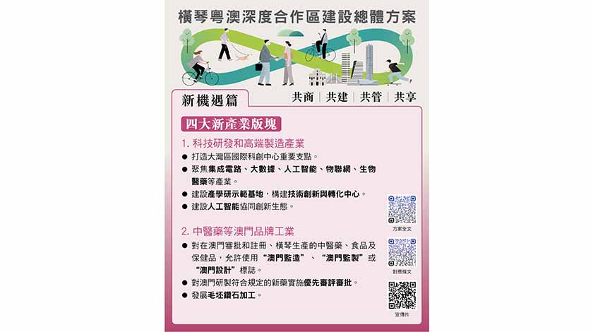 方案明確合作區有促進澳門經濟適度多元發展的新平台、便利澳門居民生活就業的新空間、豐富「一國兩制」實踐的新示範、推動粵港澳大灣區建設的新高地四個戰略定位,以及發展促進澳門經濟適度多元的新產業、建設便利澳門居民生活就業的新家園、構建與澳門一體化高水平開放的新體系、健全粵澳共商共建共管共享的新體制四項主要任務。