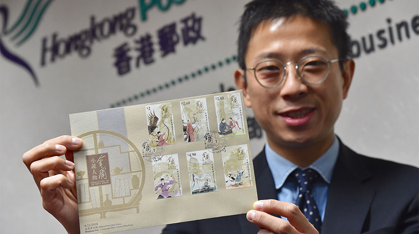 12月3日,香港郵政推出一套以金庸小說人物為主題的特別郵票及郵票小冊子,當中包括《射雕英雄傳》、《鹿鼎記》及《天龍八部》等7部小說中的人物角色。圖為香港郵政高級經理李振宇展示金庸小說人物郵品。(香港中通社圖片)
