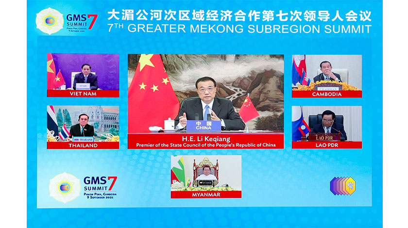 9月9日上午,中國國務院總理李克強在北京人民大會堂出席大湄公河次區域經濟合作第七次領導人會議併發表講話。柬埔寨首相洪森主持會議,老撾政府總理潘坎、緬甸國家管理委員會主席敏昂萊、泰國總理巴育、越南總理范明政和亞洲開發銀行行長淺川雅嗣出席。會議以視頻方式舉行。中新社