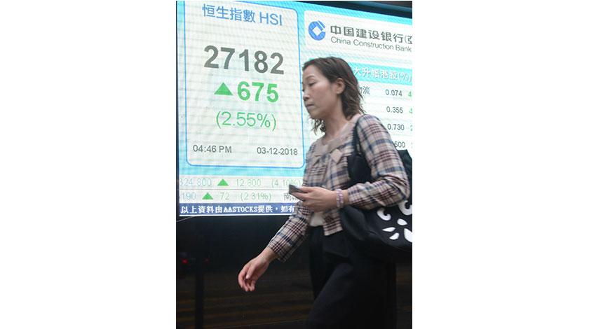 【香港中通社12月3日電】(記者 卓隆)中美兩國就經貿問題達成共識,停止相互加徵新的關稅,利好環球股市氣氛。香港股市3日顯著上升,恒生指數收報27182.04點,漲675.29點、漲幅2.55%。全日主板成交增至1296.25億港元。