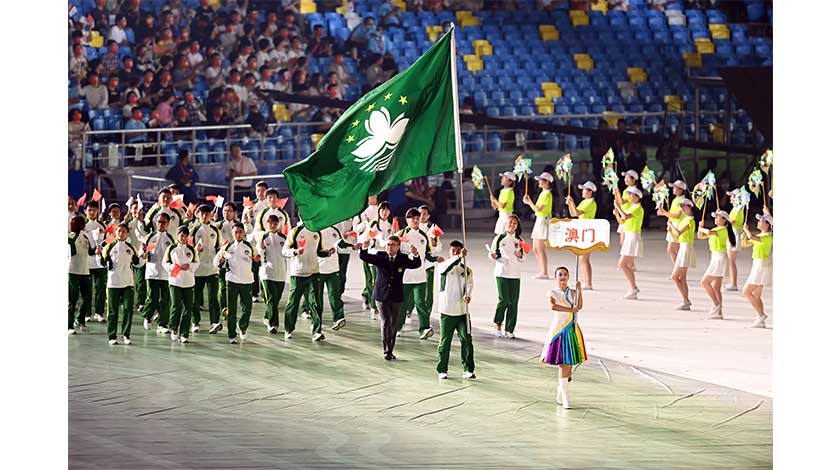 昨晚澳門隊首先進場領軍持旗手是羽毛球隊的裴鵬鋒當中尚包括有副團長潘永權率領的隊伍代表團人員等。澳門體育代表團進場在經過主席台時,受到在場觀眾熱烈歡迎。現場主持人介紹稱:現在向我們走來的是澳門特別行政區體育代表團。回歸祖國後,澳門積極踐行“一國兩制”,融入國家發展大局,體育事業取得長足發展。近年來澳門大力推進全民健身,持續推動體育發展....。