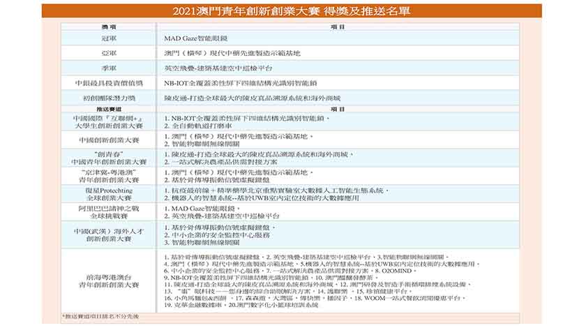 【特訊】「澳門青年創新創業大賽二○二一」總決賽完成線上評審。經專家及投資人嚴格評定後,最終由香港項目「MADGaze」以擴增實景的智能眼鏡奪得冠軍,澳門項目「澳門(橫琴)現代中藥先進製造示範基地」、「英空飛疊——建築基建空中巡視平台」勇奪亞軍和季軍。