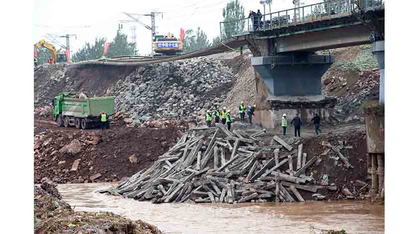 10月10日,山西晉中祁縣,南同蒲鐵路祁縣昌源河大橋下行線正在搶修中。受強降雨影響,10月6日,南同蒲鐵路山西祁縣昌源河大橋橋台尾部路基被沖空、軌枕懸空,上下行線路均中斷。經全力搶修,南同蒲鐵路上行線10月8日恢復通車。目前,下行線正在加緊搶修中。 中新社